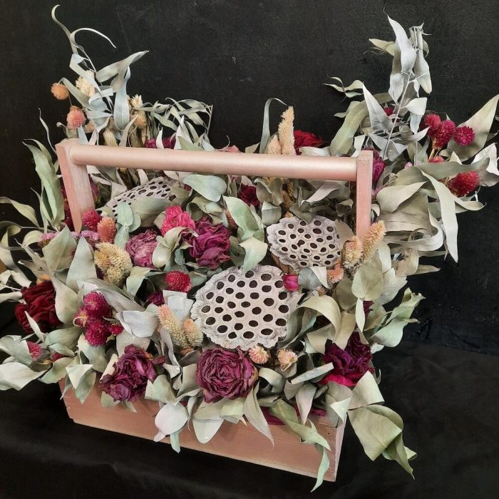 Целозия – 5 шт.Эвкалипт – 10 шт.Ящик деревянный – 1 шт.Лотос сухой – 3 шт.Оазис флористический – 2 шт.Клевер – 9 шт.