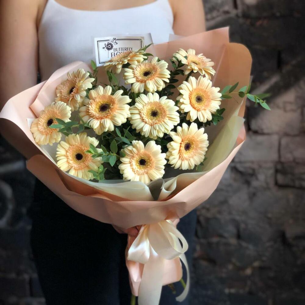 Букет из 11 персиковых мини-гербер и зелени в дизайнерской упаковке “Персиковые бабочки”