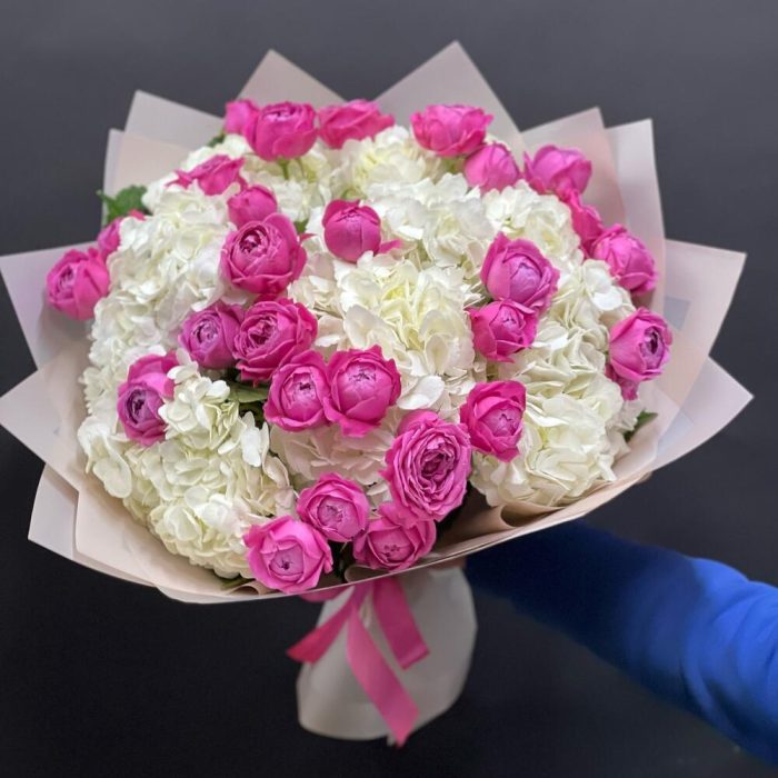 Гортензия – 7 шт.розы кустовые пионовидные – 10 шт.Упаковка дизайнерская – 5 шт.Лента атласная – 1 шт.