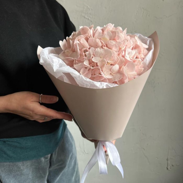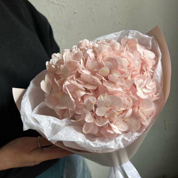 Лента атласная – 1 шт.Упаковка дизайнерская – 2 шт.Розовая гортензия – 1 шт.