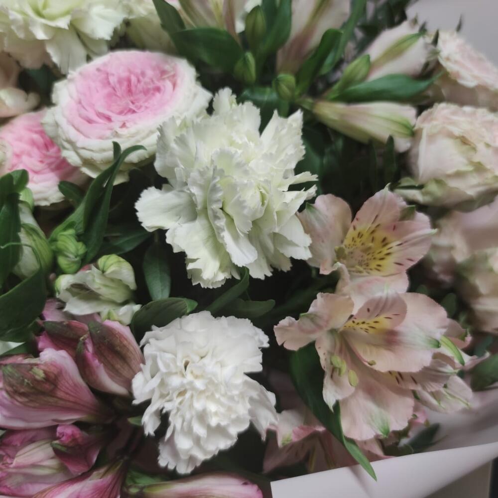 Роза кустовая – 4 шт.Альстромерия – 5 шт.Гвоздика – 5 шт.Упаковка дизайнерская – 1 шт.зелень декоративная – 3 шт.