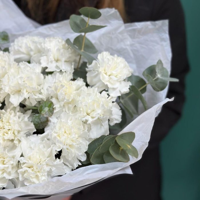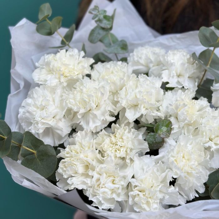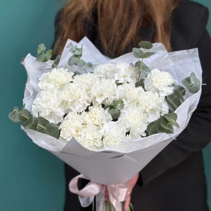 Лента – 1 шт.Эвкалипт – 1 шт.Современная упаковка – 2 шт.диантус сортовой (гвоздика) – 15 шт.