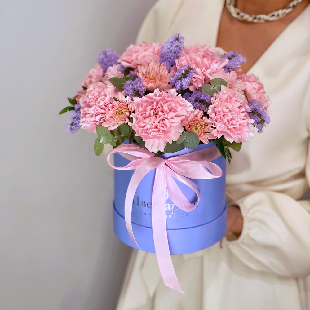 Нежная шляпная коробка с диантусами и лавандовой статицей