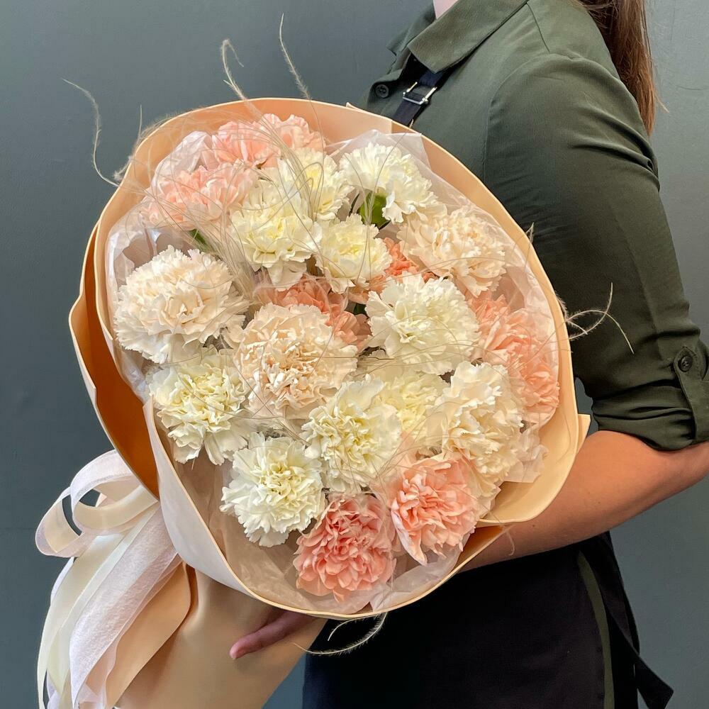 Лента – 2 шт.Гвоздика – 21 шт.Тишью – 2 шт.Упаковка дизайнерская – 2 шт.Ковыль – 2 шт.