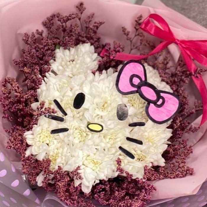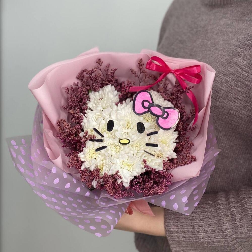 Милый необычный букет Хэллоу Китти поднимет настроение не только ребенку,но и взросломуОткрытка с вашим текстом в подарок
