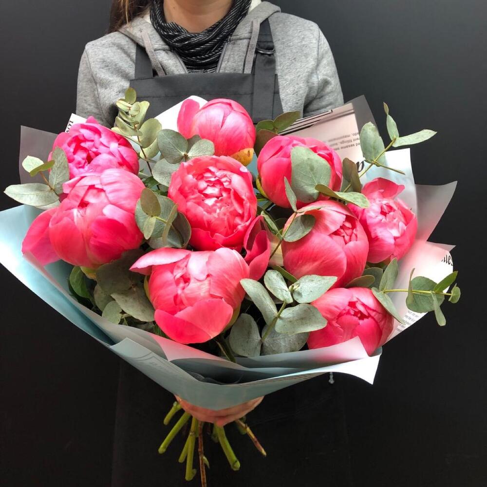 Пион – 9 шт.Эвкалипт – 5 шт.Упаковка дизайнерская – 1 шт.