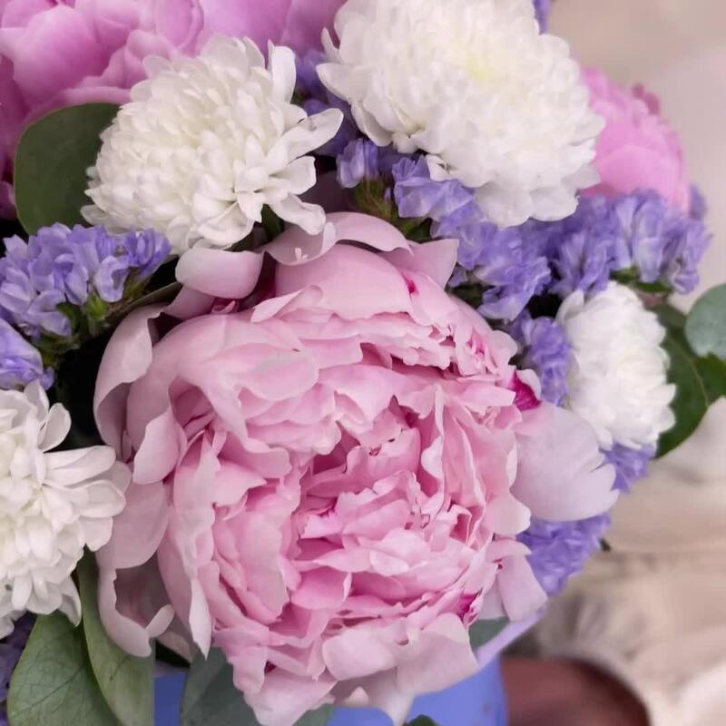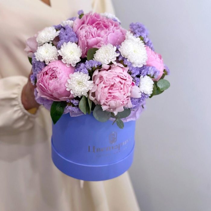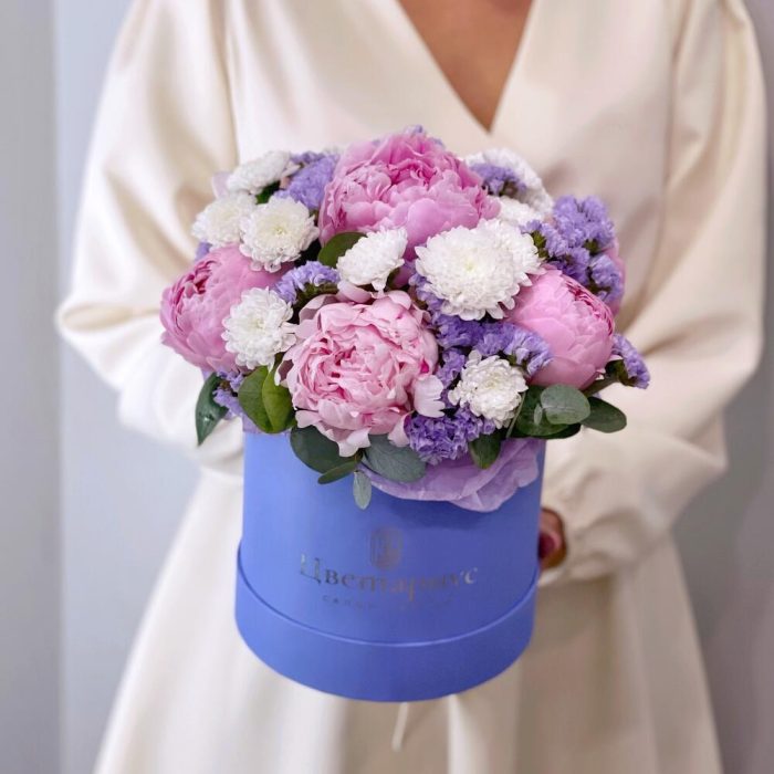 пионы розовые премиум – 7 шт.Статица лавандовая – 2 шт.Сантини – 3 шт.Эвкалипт – 2 шт.Шляпная коробка – 1 шт.