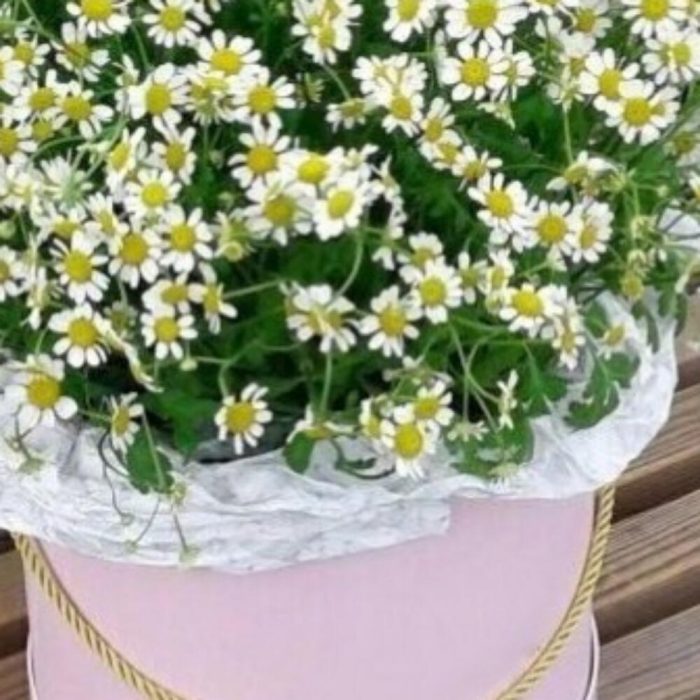 Ромашки в розовой шляпной коробке