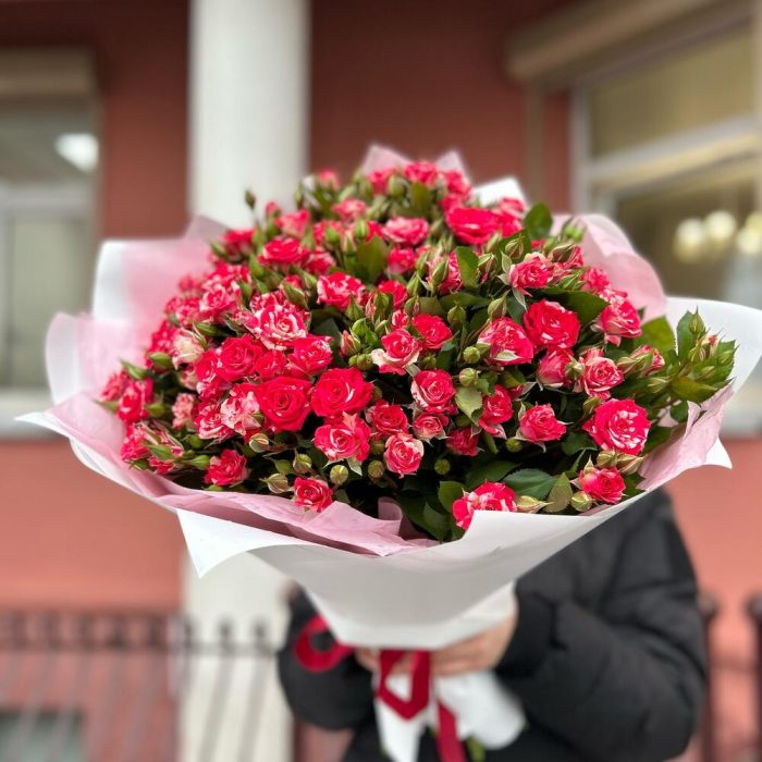 Кустовая роза – 15 шт. Матовая пленка – 1 шт. Тишью – 1 шт.