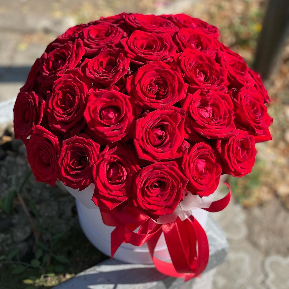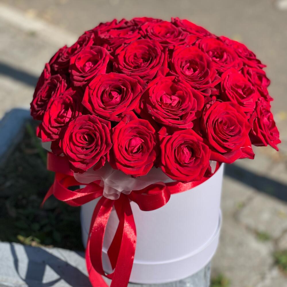 Лента – 1 шт.Роза – 31 шт.Коробка шляпная – 1 шт.Оазис флористический – 2 шт.