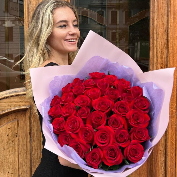 Букет РУБИНОВЫЕ УКРАШЕНИЯ из 35 красных роз. Букет 157 ALMOND ROSES