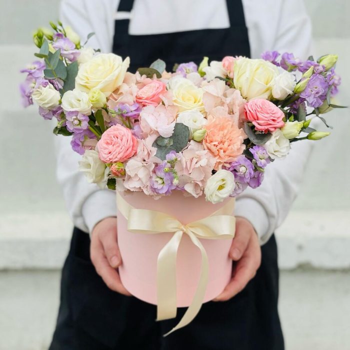 Гортензия – 1 шт.Маттиола – 2 шт.Эвкалипт – 3 шт.Гвоздика – 2 шт.Эустома – 2 шт.Лента атласная – 1 шт.Роза белая – 4 шт.Шляпная коробка – 1 шт.Бомбастик – 3 шт.Оазис флористический – 1 шт.