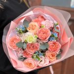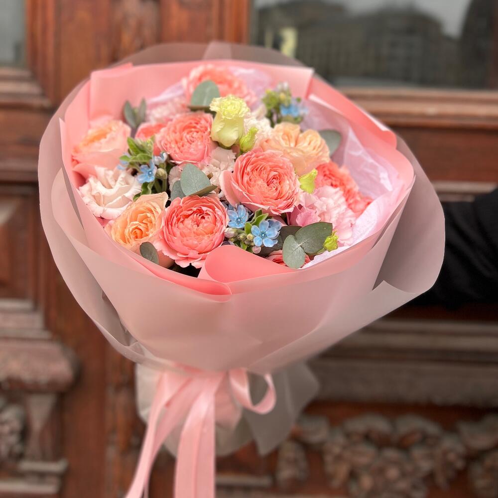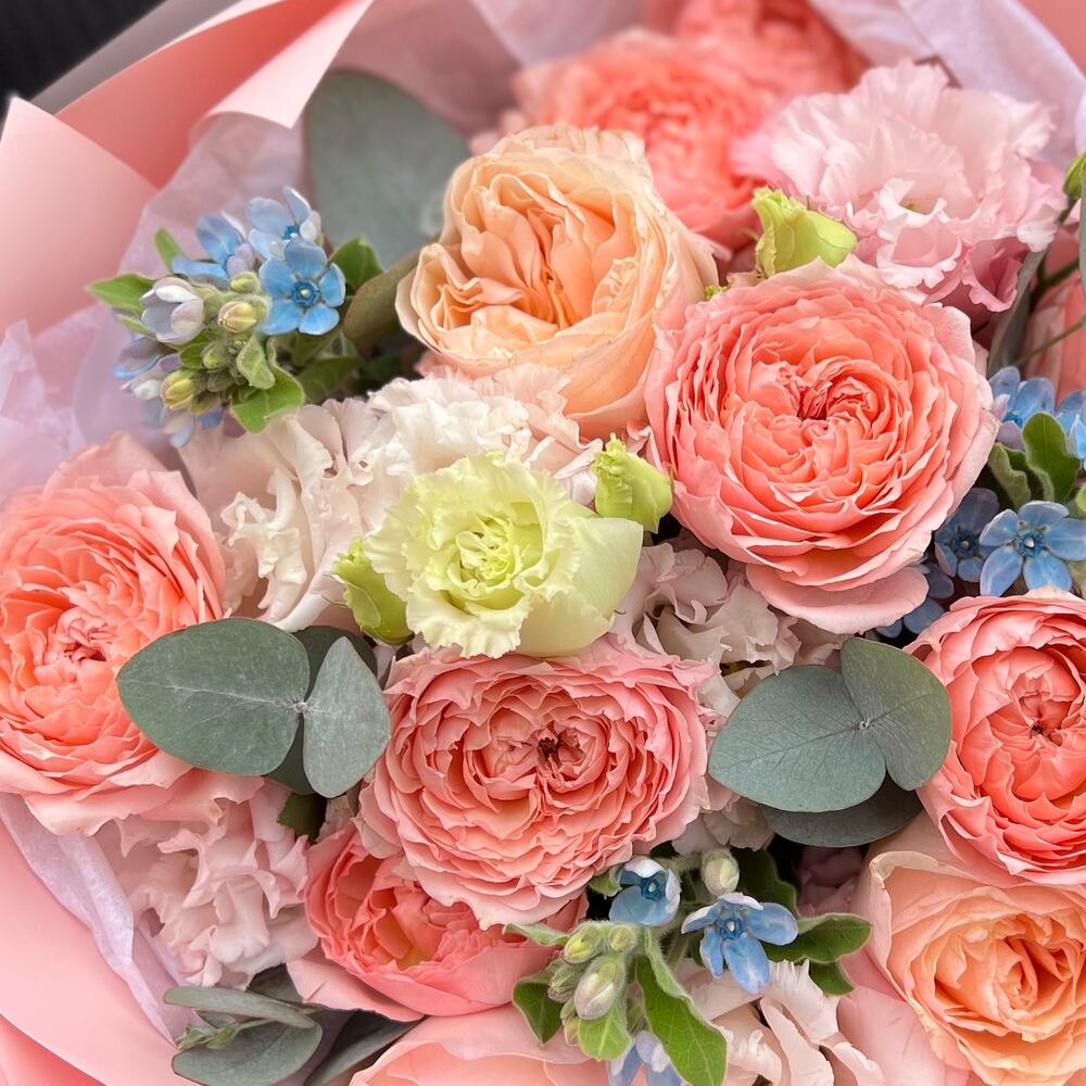 Роза пионовидная дэвида остина – 3 шт.роза пионовидная кустовая джульетта – 2 шт.эустома махровая розовая – 2 шт.Оксипеталум – 3 шт.Эвкалипт – 3 шт.Тишью – 1 шт.Пленка матовая – 7 шт.Лента атласная – 2 шт.