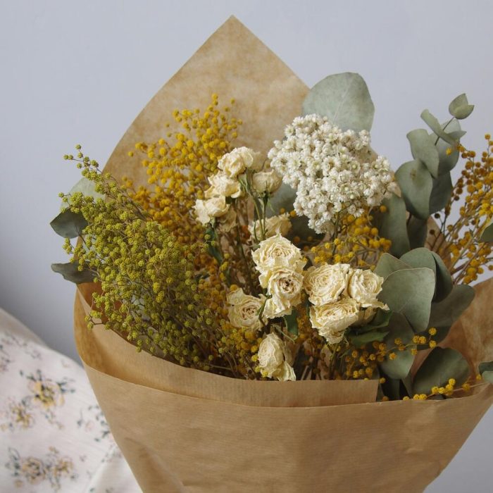 кустовая роза сухоцвет – 3 шт.озотамнус сухоцвет – 1 шт.эвкалипт сухоцвет пучок – 1 шт.мимоза пучок сухоцвет – 1 шт.Крафт упаковка – 1 шт.транспортировочная упаковка – 1 шт.