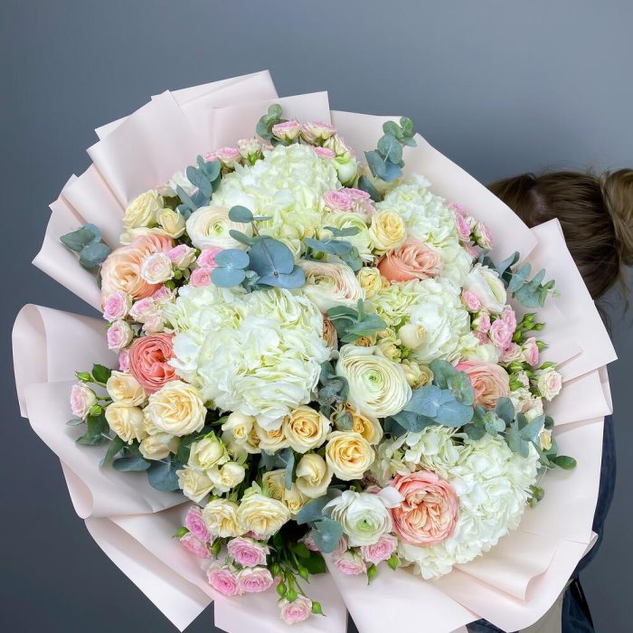 Категорий: Гортензии, Пионовидные розы, Ранункулюс, Розы, Эвкалипт