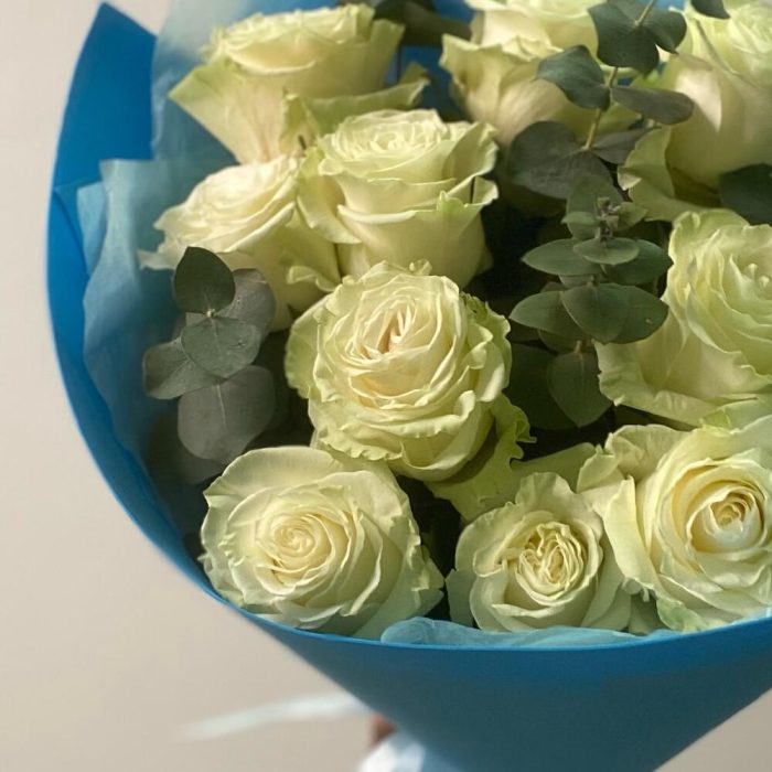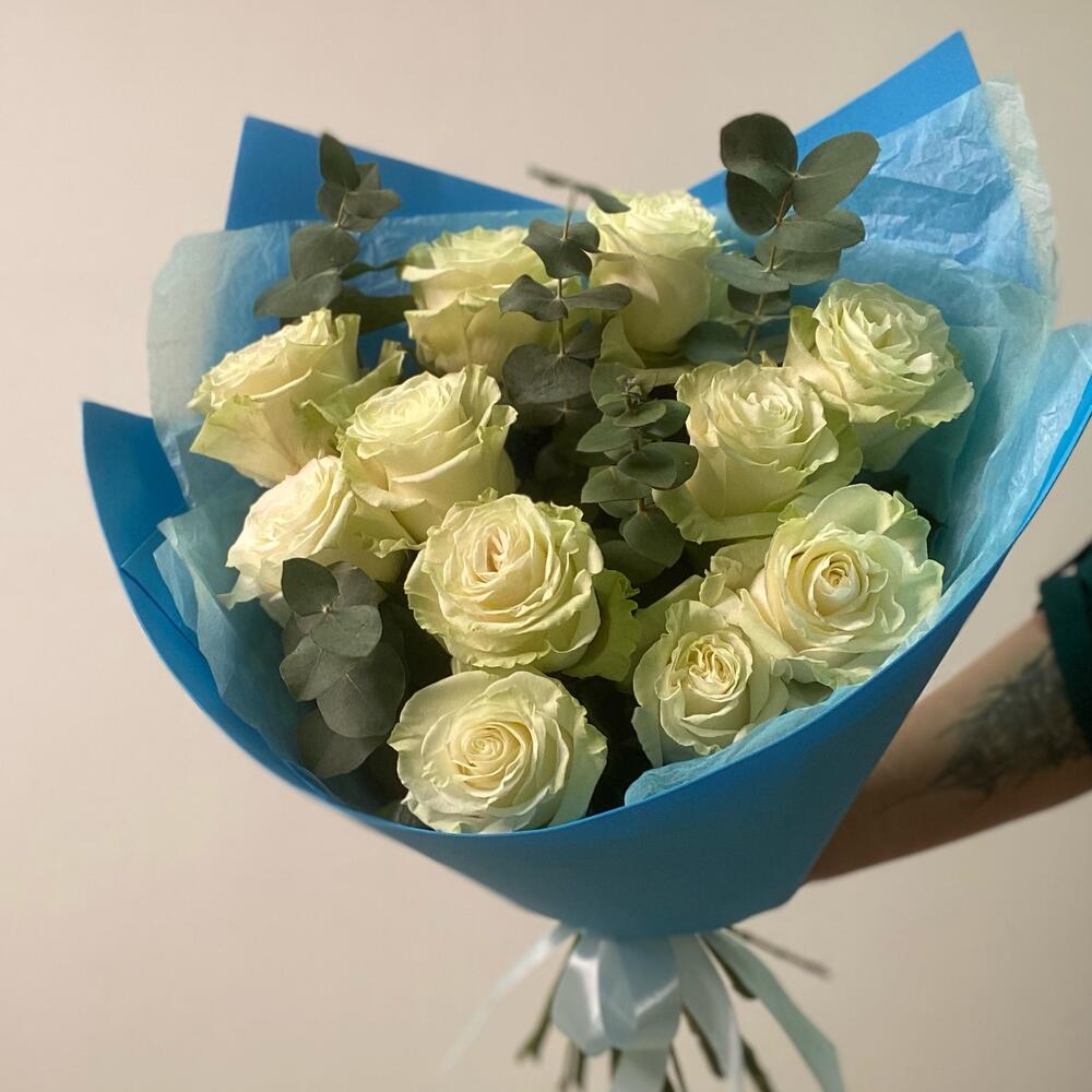 Эвкалипт – 2 шт.Роза – 11 шт.Лента атласная – 1 шт.Упаковка дизайнерская – 1 шт.
