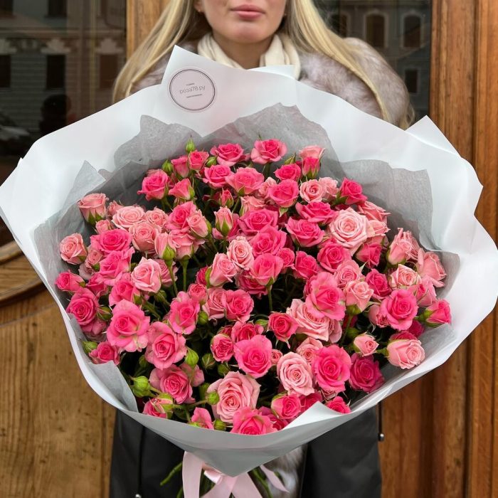 Роза кустовая 60 см – 25 шт.Дизайнерская упаковка – 3 шт.Тишью – 1 шт.Лента атласная – 2 шт.