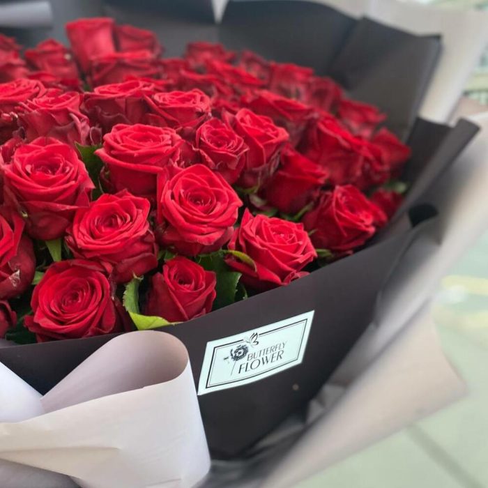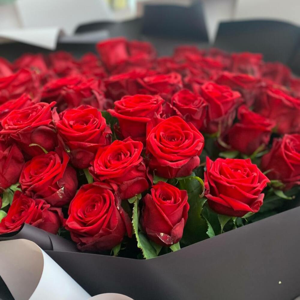 Букет из 59 красных роз в стильной упаковке “Брегенц”