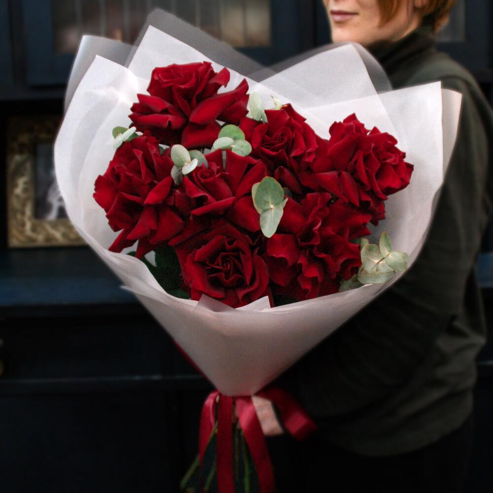 Эвкалипт – 2 шт.Тишью – 2 шт.Атласная лента – 2 шт.Французская роза – 7 шт.Матовая пленка – 2 шт.