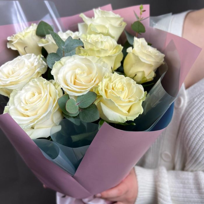Эвкалипт – 3 шт.Лента атласная – 2 шт.Пленка матовая – 5 шт.Роза мондиаль 50 см – 9 шт.пленка полупрозрачная – 4 шт.