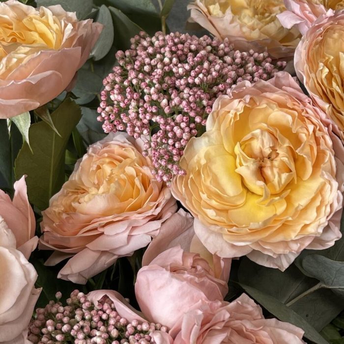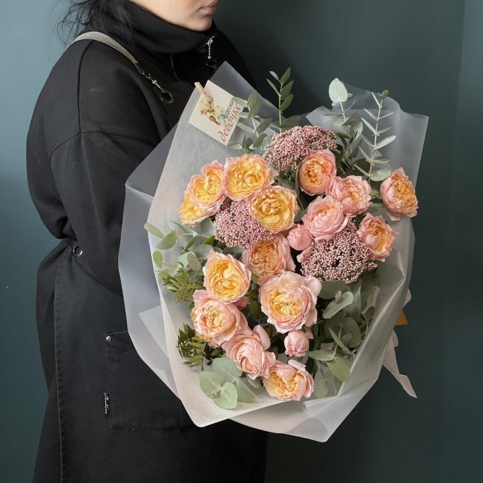 Лента – 1 шт.Эвкалипт – 2 шт.Фисташка – 3 шт.Упаковка дизайнерская – 2 шт.Роза Джульетта – 5 шт.озотамнус сухоцвет – 3 шт.