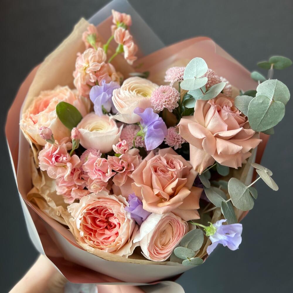 Душистый горошек – 4 шт.Ранункулюс – 3 шт.Пионовидная роза – 2 шт.Одноголовая роза – 2 шт.Маттиола – 3 шт.Сантини – 3 шт.Эвкалипт – 4 шт.декоративная упаковка – 1 шт.Атласная лента – 1 шт.