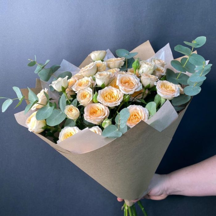 Роза кустовая – 5 шт.Крафт дизайнерский – 4 шт.Эвкалипт ценария – 2 шт.