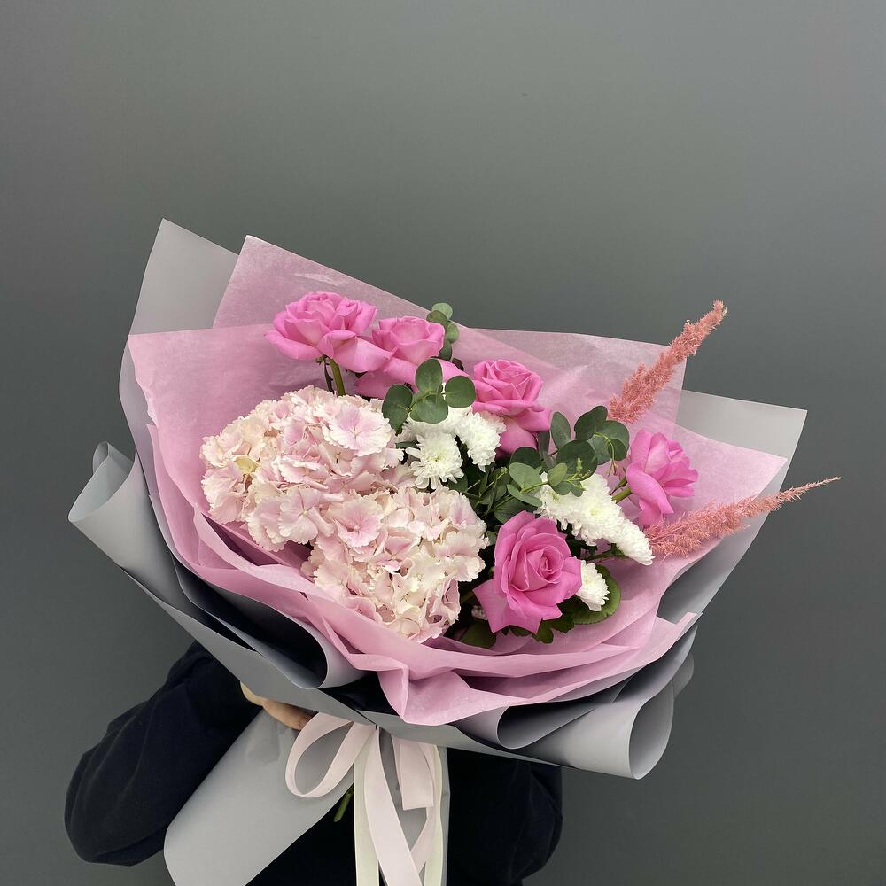 Альстромерии, Гвоздики, Кустовые розы, Лизиантусы, Розы, Хризантемы