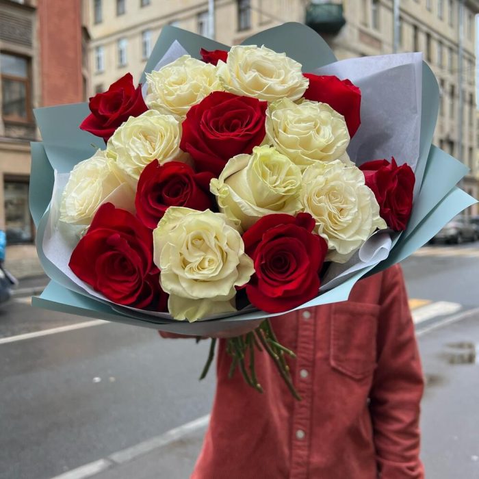 Букет с красной и белой розой 15шт