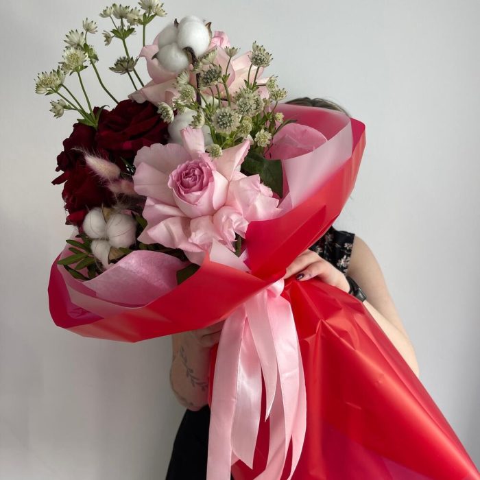 Хлопок – 4 шт.Лента атласная – 2 шт.Фисташка – 1 шт.Французская роза – 2 шт.Пленка матовая – 6 шт.астронция – 2 шт.