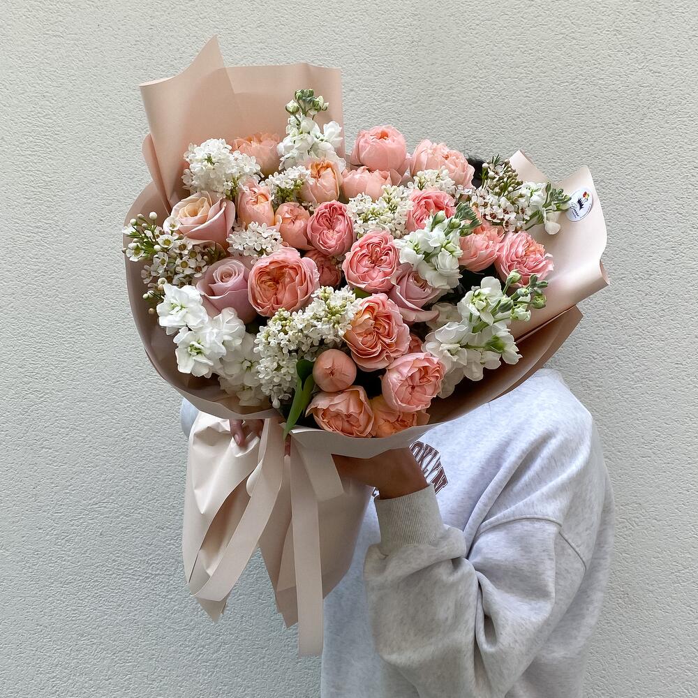 Роза – 5 шт. Маттиола – 5 шт. Ваксфлауэр – 2 шт. Сирень – 3 шт.