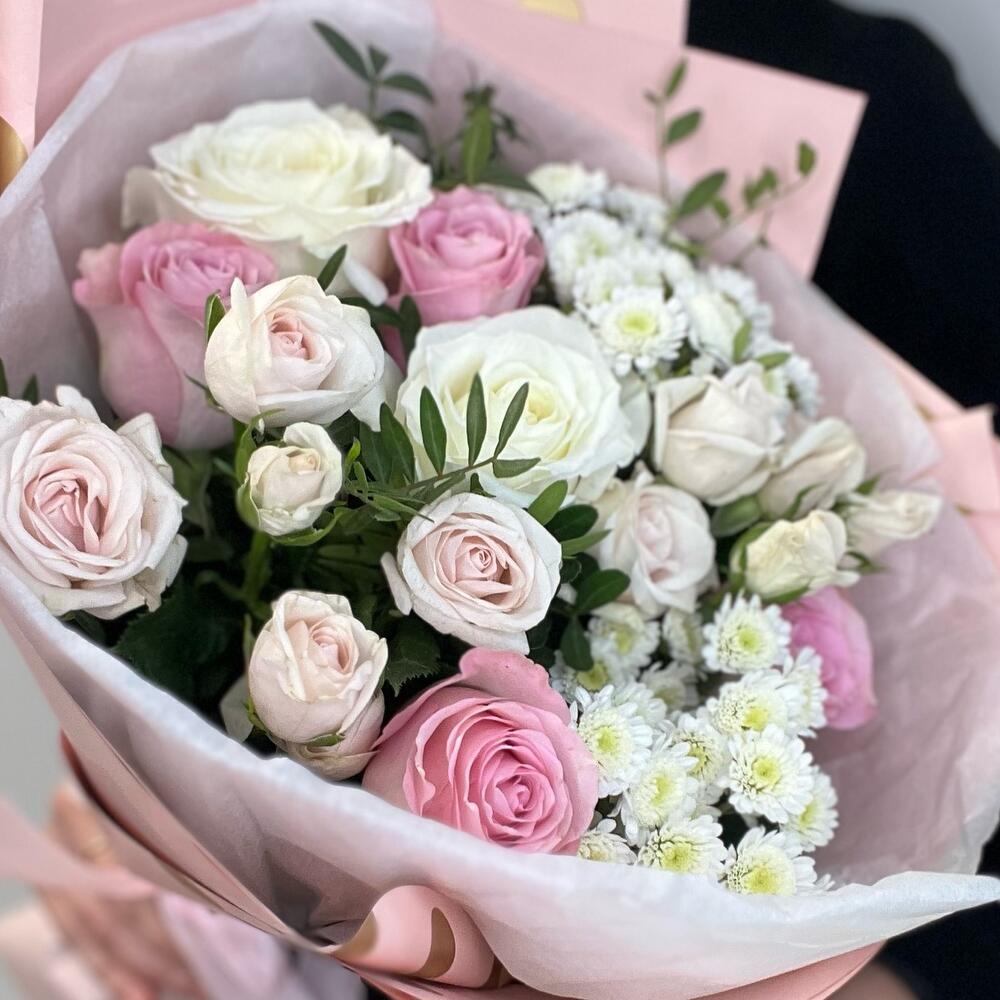 Роза розовая 50 см – 4 шт.Роза белая – 2 шт.Хризантема Сантини – 2 шт.Роза кустовая – 2 шт.Зелень – 1 шт.Упаковка – 1 шт.