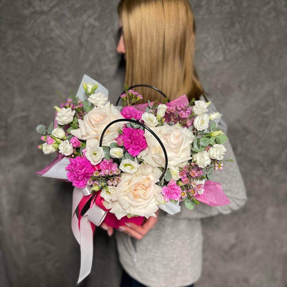 Роза пионовидная – 3 шт.Лизиантус Алиса белый – 3 шт.Диантус кустовой – 3 шт.Диантус одноголовый – 3 шт.Ваксфлауэр – 3 шт.Эвкалипт Baby Blue – 15 шт.Упаковка дизайнерская – 1 шт.Тишью – 2 шт.Сумка – 1 шт.Оазис – 1 шт.