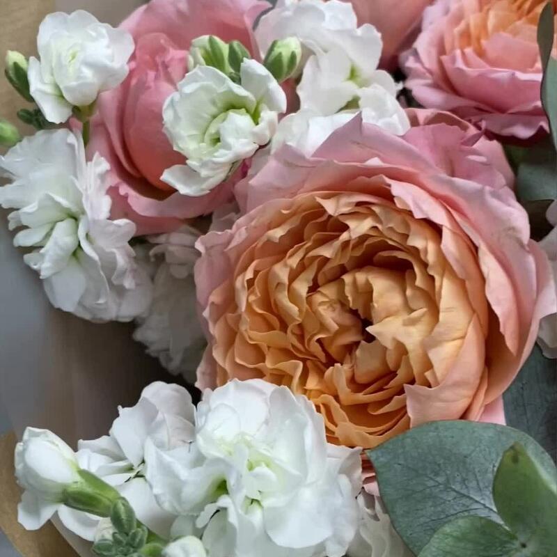 Кустовая пионовидная роза – 5 шт.маттиола белая ароматная – 9 шт.Упаковка – 2 шт.эвкалипт 50 – 6 шт.