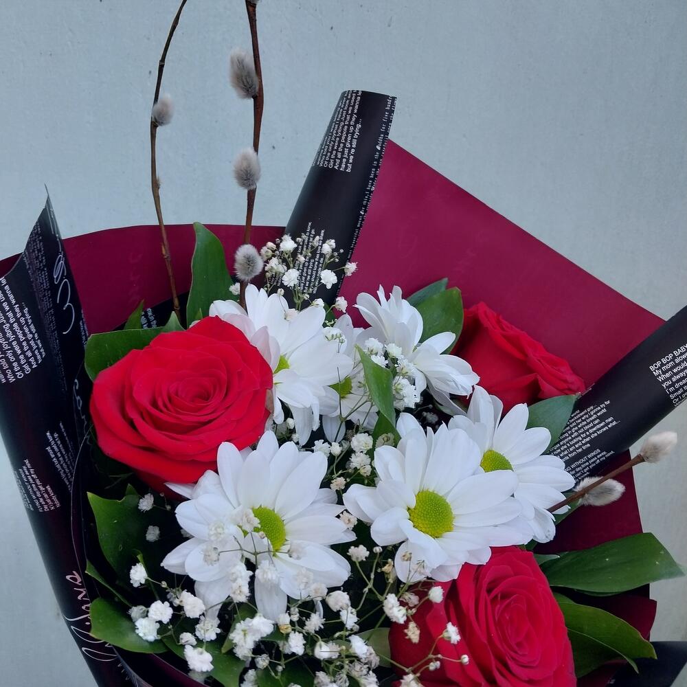 Роза Эквадор – 3 шт.Лента атласная – 1 шт.Упаковка дизайнерская – 4 шт.Рускус сочи – 10 шт.гипсофила белая – 1 шт.верба натуральная – 3 шт.бакарди ромашка хризантема кустовая – 1 шт.
