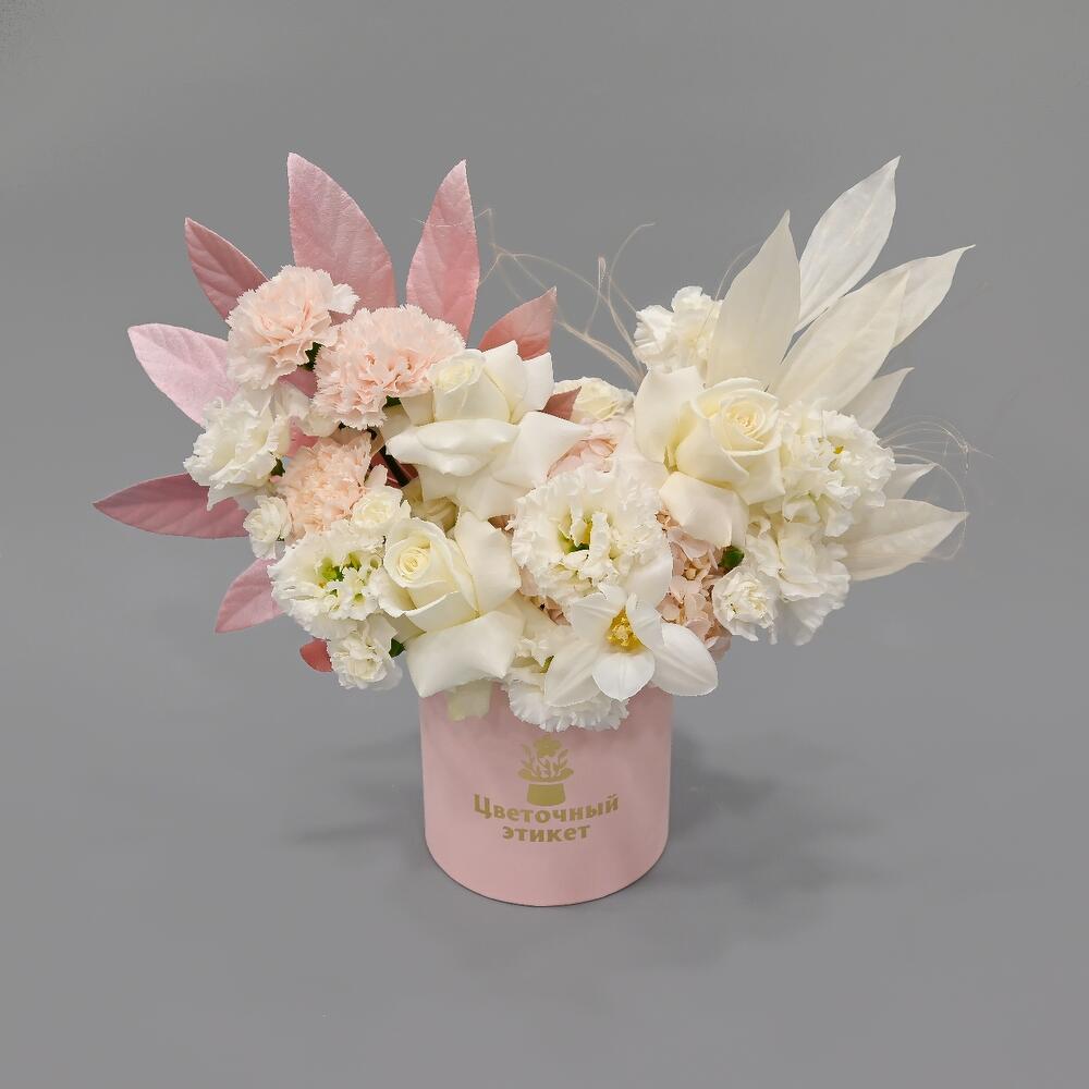 Тюльпан – 1 шт.Пионовидная роза – 3 шт.Гвоздика – 7 шт.Лизиантус Алиса белый – 2 шт.Гортензия розовая – 1 шт.Аралия – 1 шт.Рускус – 3 шт.Ковыль – 3 шт.Роза кустовая – 2 шт.Шляпная коробка – 1 шт.Гвоздика кустовая – 2 шт.коккулус – 1 шт.