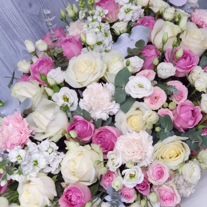 Лента атласная – 3 шт.Корзина плетеная большая – 1 шт.Маттиола белая – 3 шт.Роза белая 50 см – 16 шт.Оазис флористический – 3 шт.Роза розовая 50 см – 19 шт.эустома белая – 7 шт.Эвкалипт Baby Blue – 5 шт.Роза кустовая белая 50 см – 3 шт.гвоздика белая сортовая – 5 шт.роза кустовая розовая пионовидная – 4 шт.гвоздика розовая диантус – 6 шт.октрытка ручной работы – 1 шт.