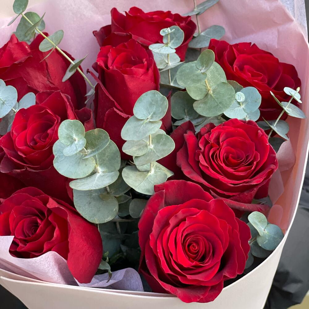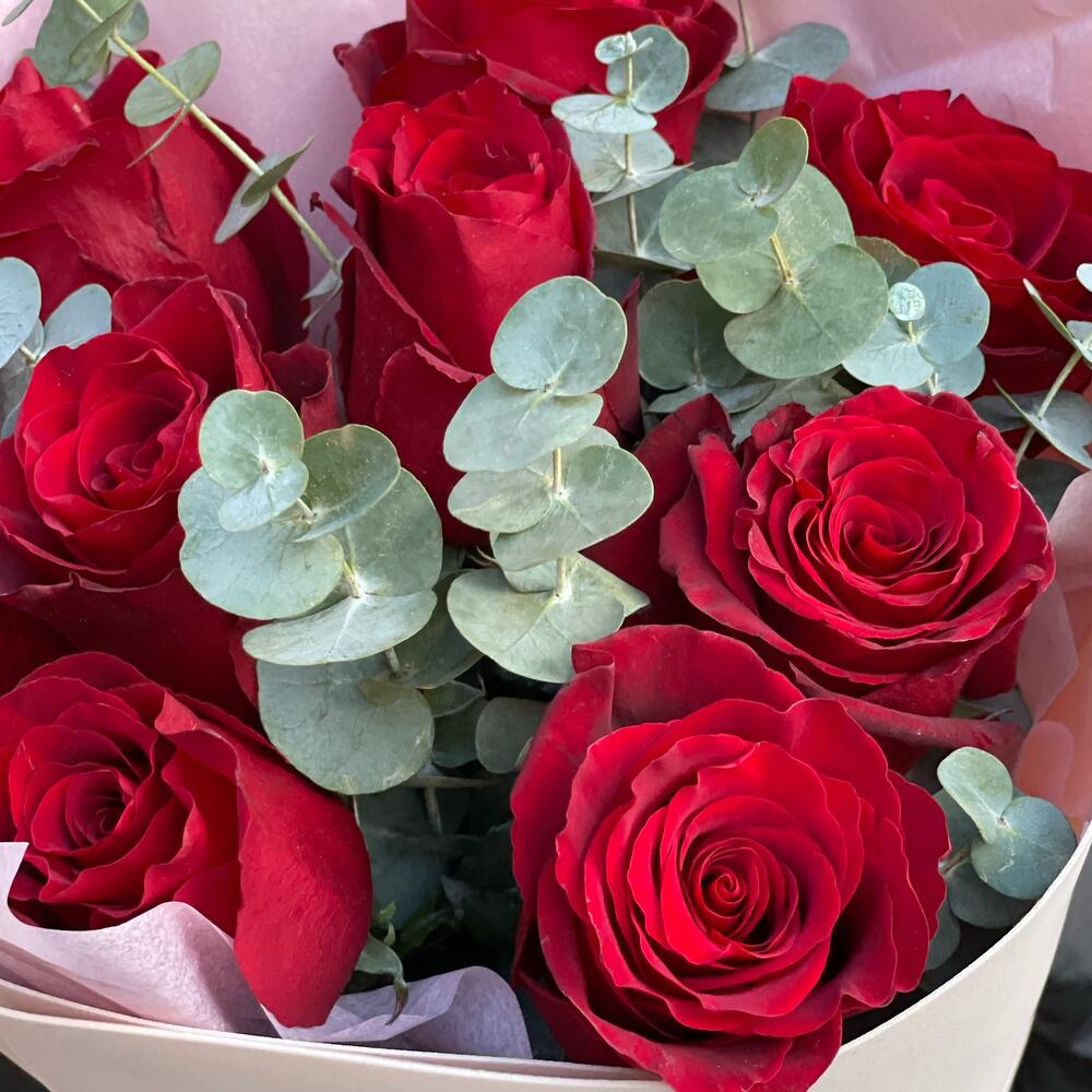 Красные розы с эвкалиптом