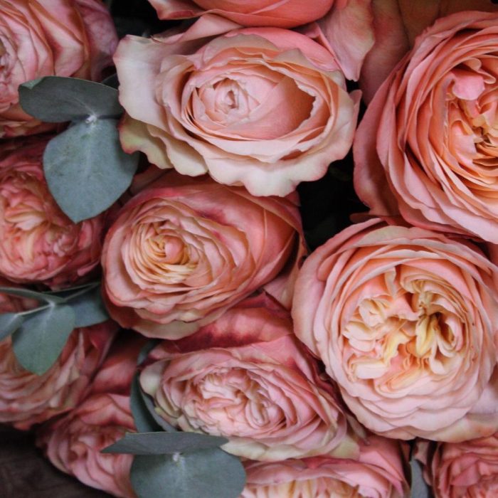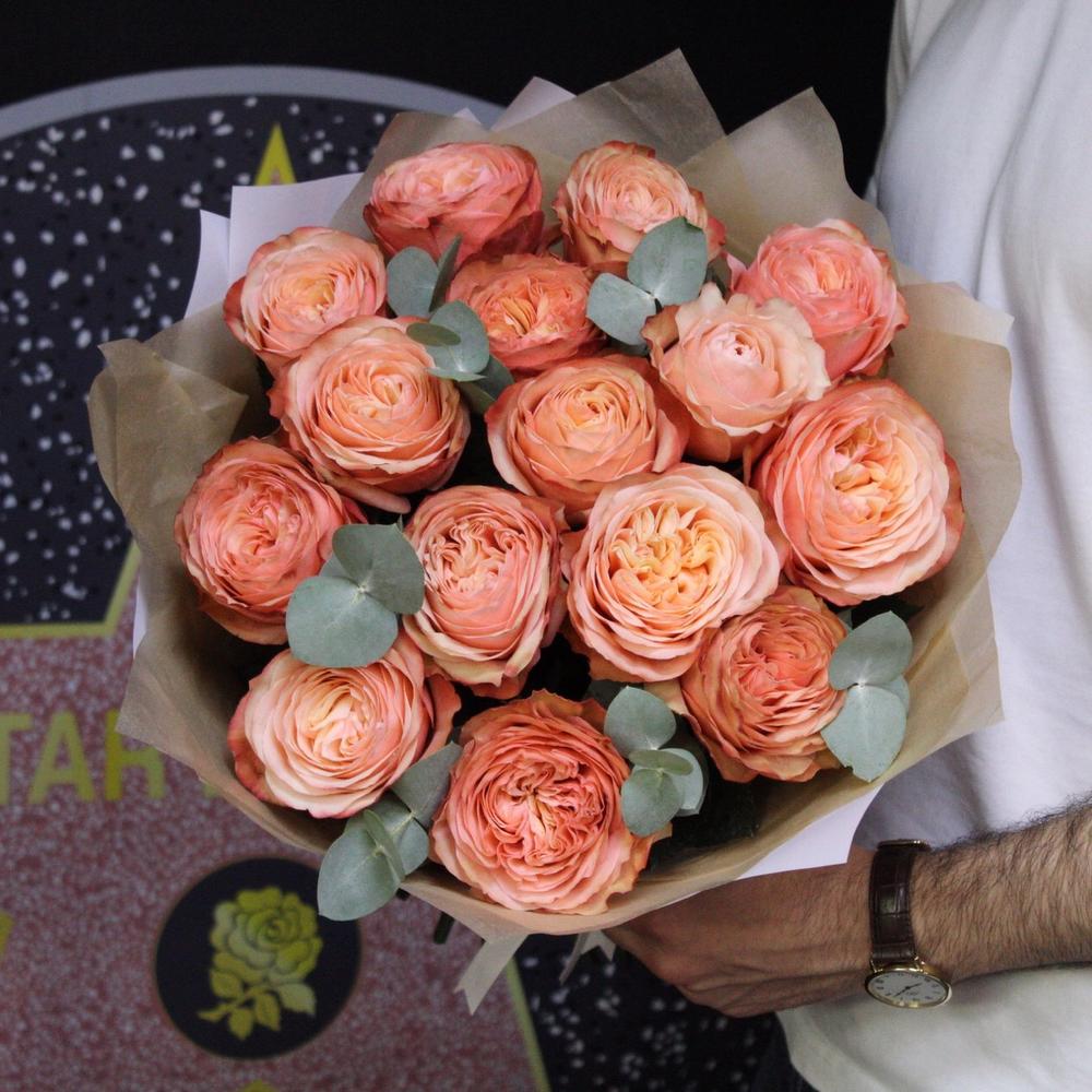 Роза пионовидная – 15 шт.Эвкалипт – 3 шт.Пленка дизайнерская – 3 шт.