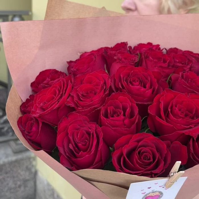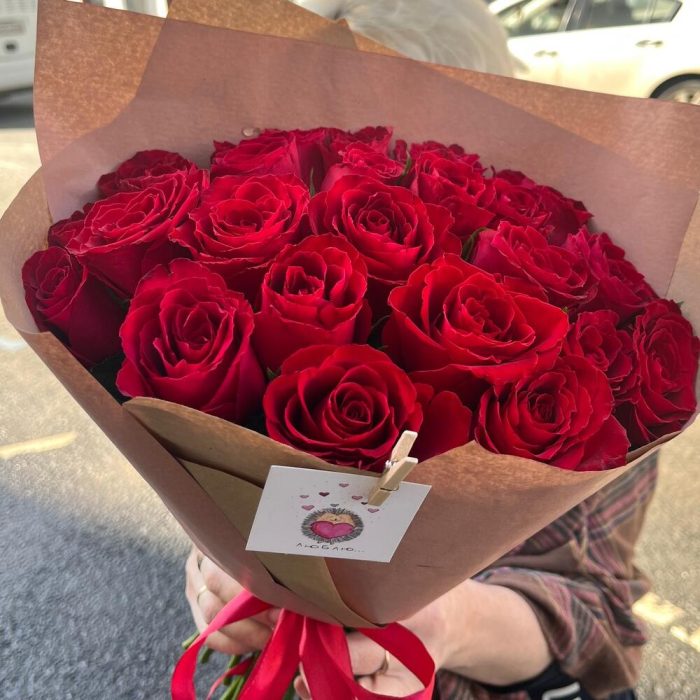 ЛЮБЛЮ 25 красных стойких роз в крафте