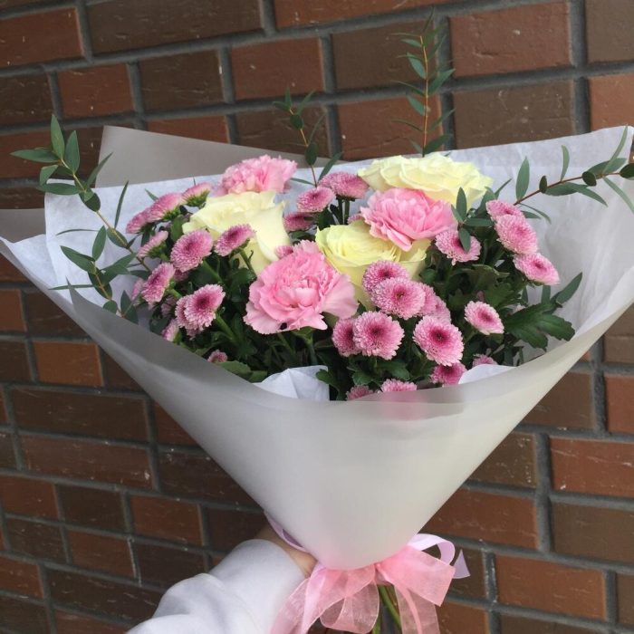 Роза – 3 шт.Гвоздика – 3 шт.Хризантема кустовая – 5 шт.Эвкалипт – 2 шт.