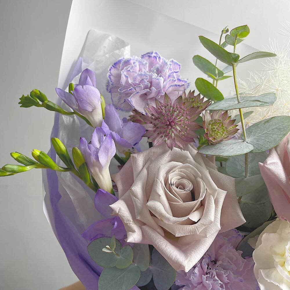 Роза кустовая – 1 шт.Фрезия – 2 шт.Диантус – 3 шт.Роза Мента – 2 шт.Упаковка дизайнерская – 1 шт.Астранция – 2 шт.аспарагус стабилизированный – 1 шт.