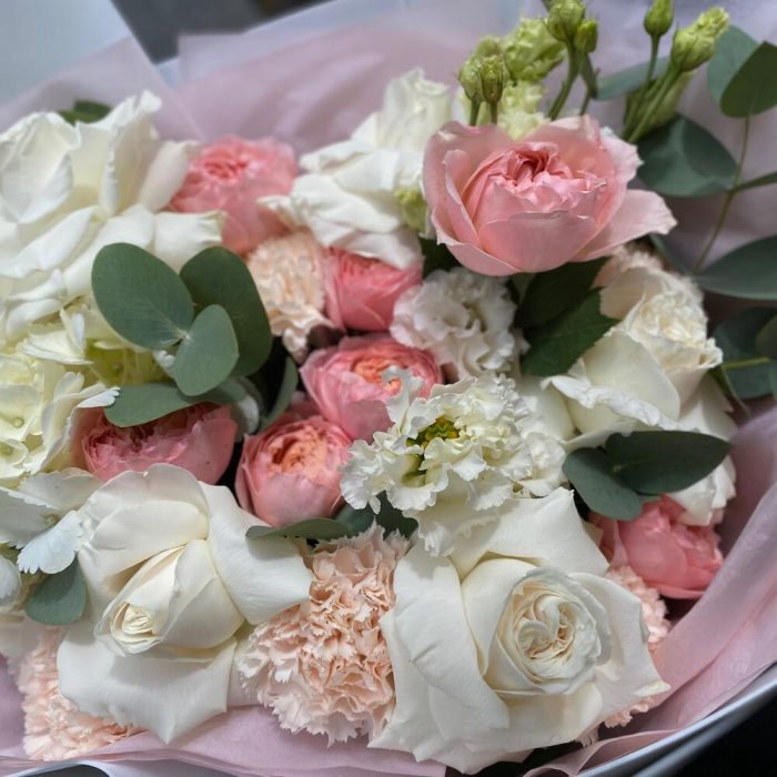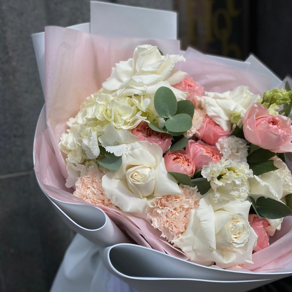Категорий: Гвоздики, Гортензии, Лизиантусы, Пионовидные розы, Розы, Хризантемы