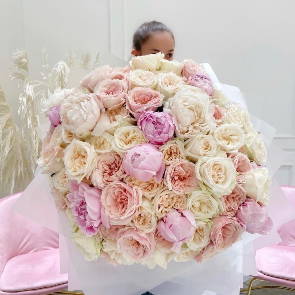 Пион розовый – 9 шт.розы пионовидные – 42 шт.Упаковка дизайнерская – 2 шт.Лента атласная – 2 шт.Открыточка с вашими пожеланиями – 1 шт.хорошее настроение – 100 шт.инструкция по уходу за цветами – 1 шт.коробка переноска – 1 шт.Кризал – 1 шт.