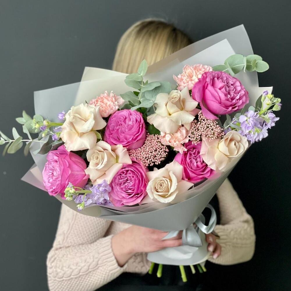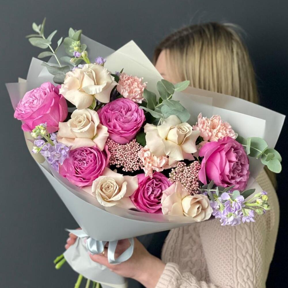 Гвоздики, Кустовые розы, Лизиантусы, Пионовидные розы, Розы