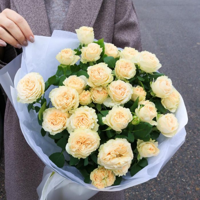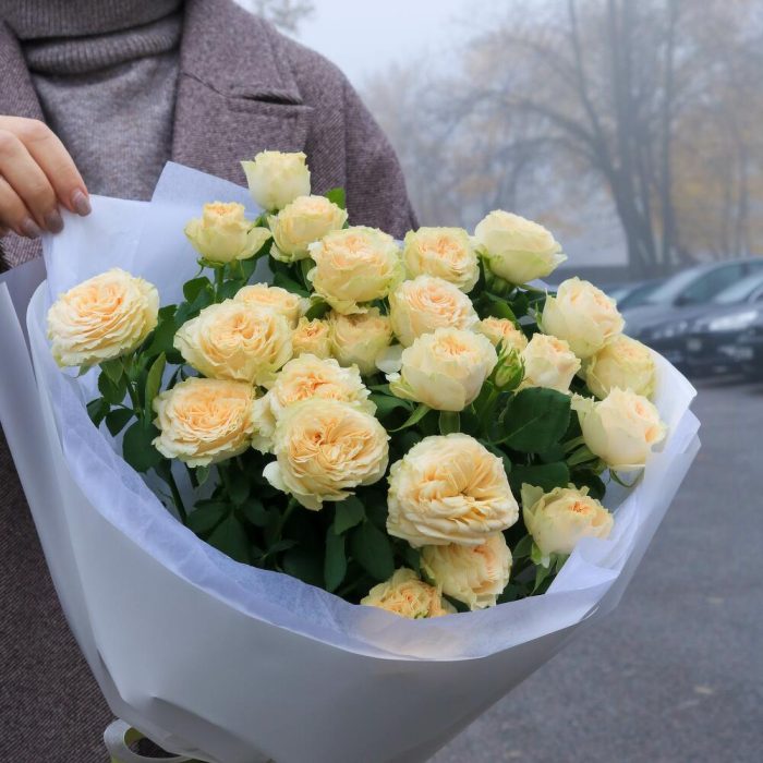 Пионовидная кустовая роза с легким цветочным ароматом.