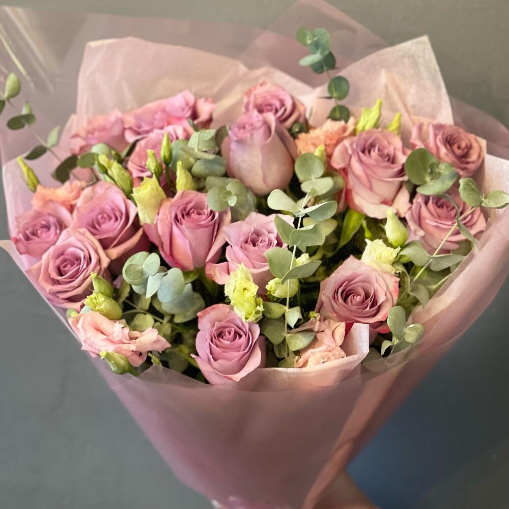 Сиреневые розы с эвкалиптом «Сирень» на день рождения , маме, сестре, подруге