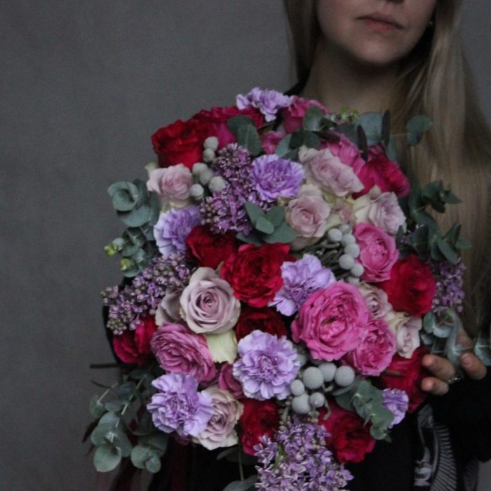 Маттиола – 5 шт.Роза пионовидная – 9 шт.Роза пионовидная кустовая – 5 шт.Роза Эквадор – 9 шт.Бруния – 3 шт.Диантус – 9 шт.Эвкалипт – 11 шт.Фисташка – 5 шт.Лента атласная – 2 шт.Сирень – 3 шт.