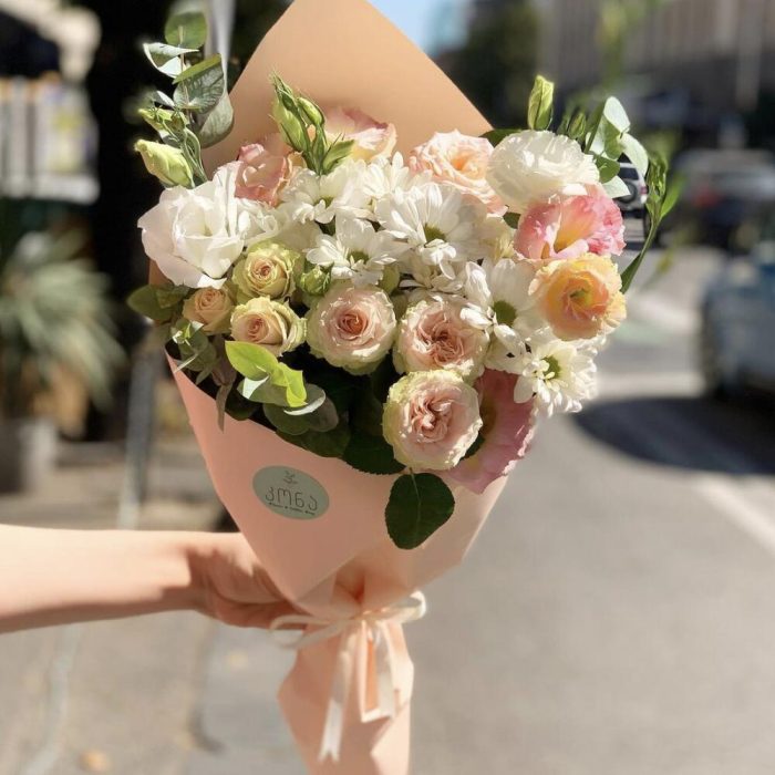 Spray rose – 2 шт. eustoma pinkwhite – 5 шт. Chrysanthemum white – 1 шт. Eucalyptus – 5 шт.