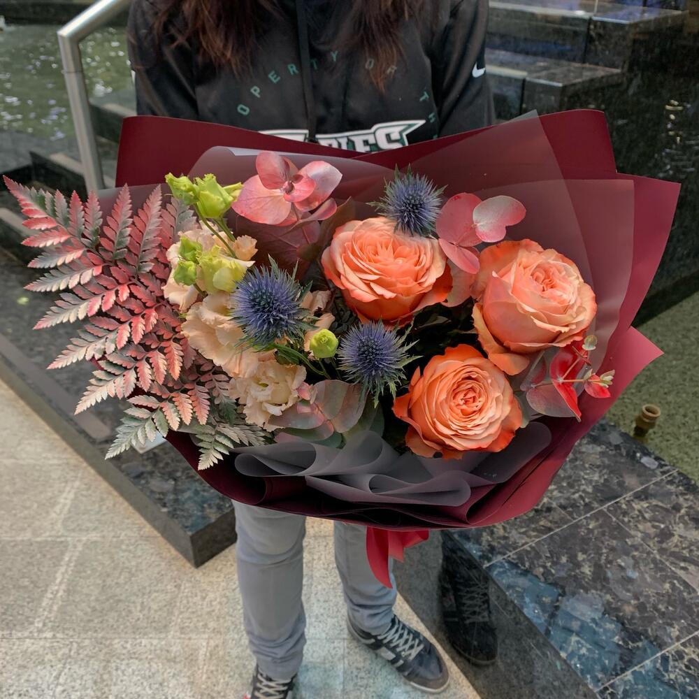 кахала роза пионовидная – 3 шт.Эрингиум синий – 1 шт.эустома персиковая – 1 шт.Эвкалипт – 1 шт.